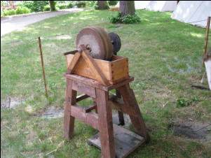Hier haben wir einen orginalen Harzer Sandstein in einem Gestell nach einem Vorbild aus dem Jahr 1472. Der Sandstein wird durch Fußtritt angetrieben.
