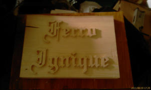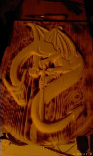 Hier haben wir unser Wappen, auf welchem auch unser Copyright liegt.Das Wappen und der Schriftzug wurden aus dem Buchenholz herausgeschnitzt und danach mit Leinöl-Firnis versiegelt. Der Drache erhebt sich dreidimensional aus dem Holz. Dieser Prozess kann mit fast allen Arten von Grafiken wiederholt werden.