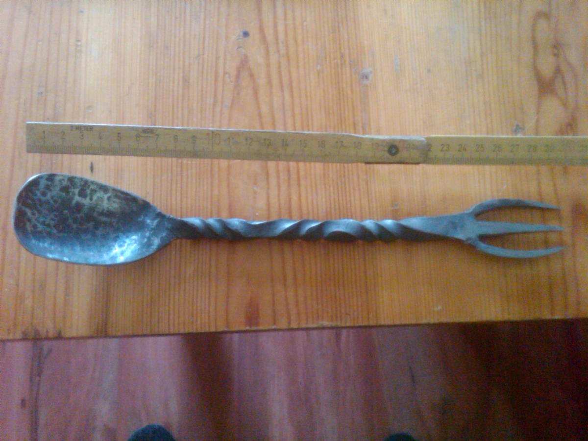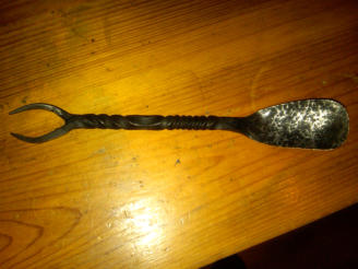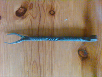 Göffel aus Messerstahl mit zwei Zinken und Tordierung am Griff